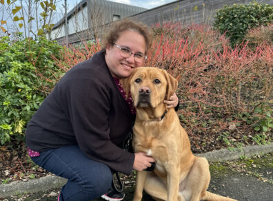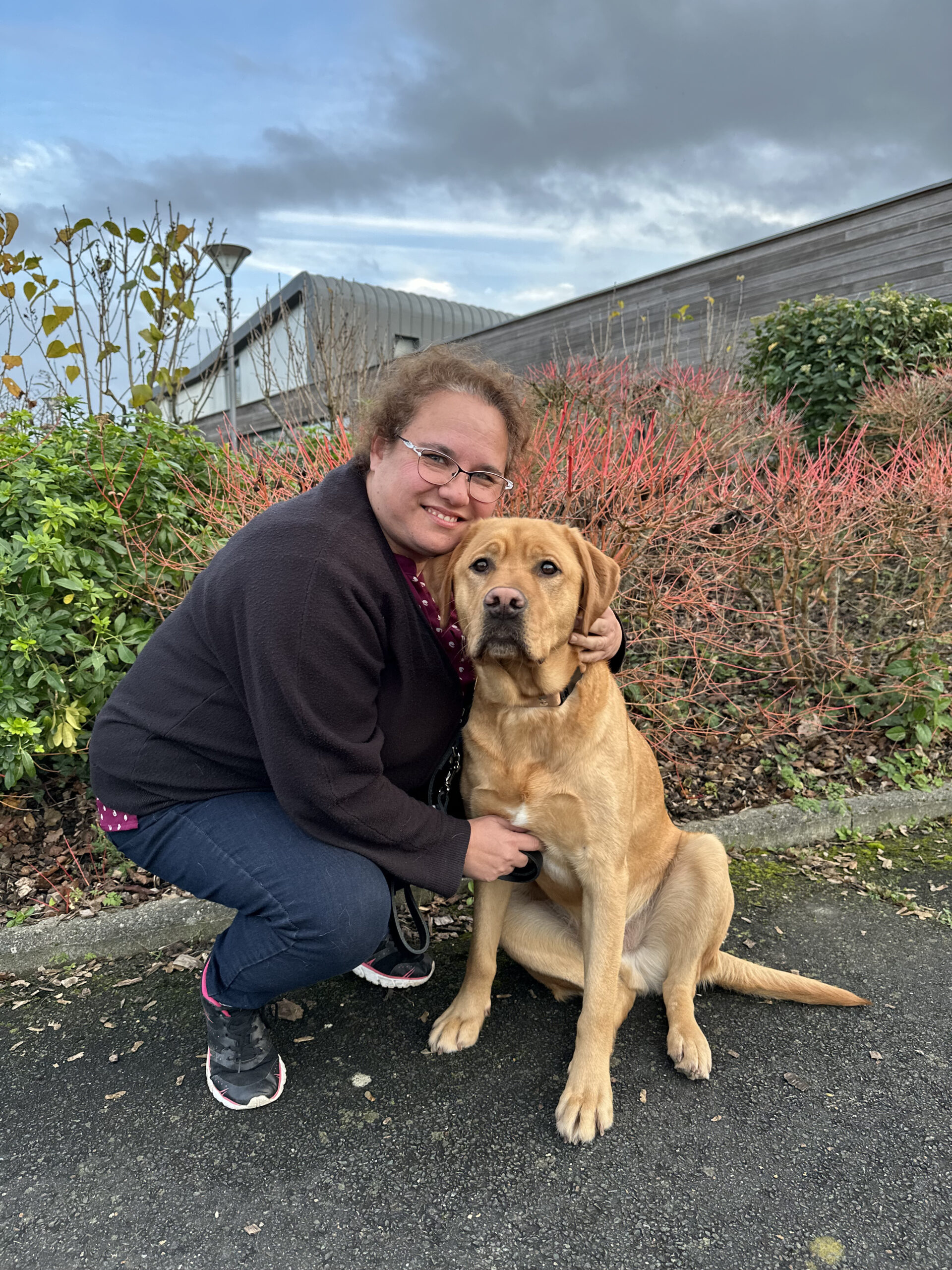 "Utou et moi nous connaissons depuis peu. Nous venons de finir notre formation mais déjà une grande complicité nous unit. C’est un chien joyeux, câlin, expressif, attachant et un peu polisson. Un grand labrador bien dans ses coussinets, avec son petit caractère. On était fait pour s’entendre ! Il me guide déjà avec empathie et efficacité dans les rues de mon village, sur les routes de campagne ou pendant la visite d’un château. Il m’apporte cette assurance qui me manquait pour de nouveau lever les yeux et reconnaître les personnes que je croise, observer les oiseaux dans les arbres, admirer les façades… Je peux profiter de mon environnement et m’aventurer seule là où je ne me sentais plus en sécurité. Les deux semaines de formation ont été aussi intenses qu’intéressantes et constructives. Un grand merci à Esseline et Axel pour leur professionnalisme et leur bienveillance. Merci aussi à Angélique pour son soutien, à Peggy pour son accueil et à Odile et Francis pour leur fabuleux engagement en tant que famille d’accueil. Et merci à Utou d'intégrer notre famille avec tellement d’entrain et d’amour." Claire